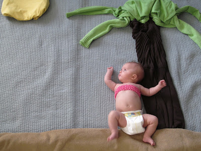 | Julianna – with brown throw (sand) blue bedspread (sky), brown dress (tree trunk) two green sweaters (palms) and yellow t-shirt (sun). |