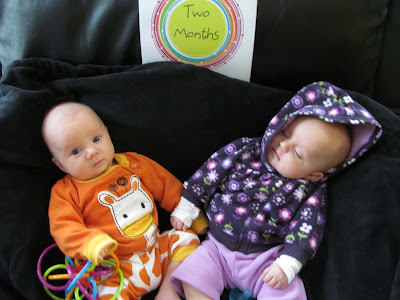 I am stealing this idea from another twin mom blogger, Mandy at The Fabulous Baby Striblings – tracking certain things each month in an update to see how my little ones are progressing. One of my biggest regrets in mommyhood so far is not taking an official “One Month” picture (although we did take tons of pictures) so we’re a little behind. We’ll catch up for sure though. 🙂