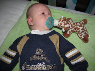 What’s a wubbanub you ask? It’s a pacifier holder, with an adorable baby safe stuffed animal on the end, which props the soothie pacifier into the mouth. We could find no where local that sold them here in Pittsburgh, so we ordered from amazon and boy are they cute! It’s taken a while for the babies to get used to them, (and Julie’s not quite got the hang of hers) but they do seem to love the softness of these sweet critters. Brayden’s wubbanub is a giraffe, and Julie’s is a cutsie caterpillar. So far, we wouldn’t say that these have been “miracle workers” as a good swift swing of brayden’s arms and the giraffe will be tossed across the crib. There has been improvement though, and they do seem to smile and look at the contrast quite a big. Now if we could keep Duncan and Layla away from the temptation of claiming the wubbanubs for themselves!