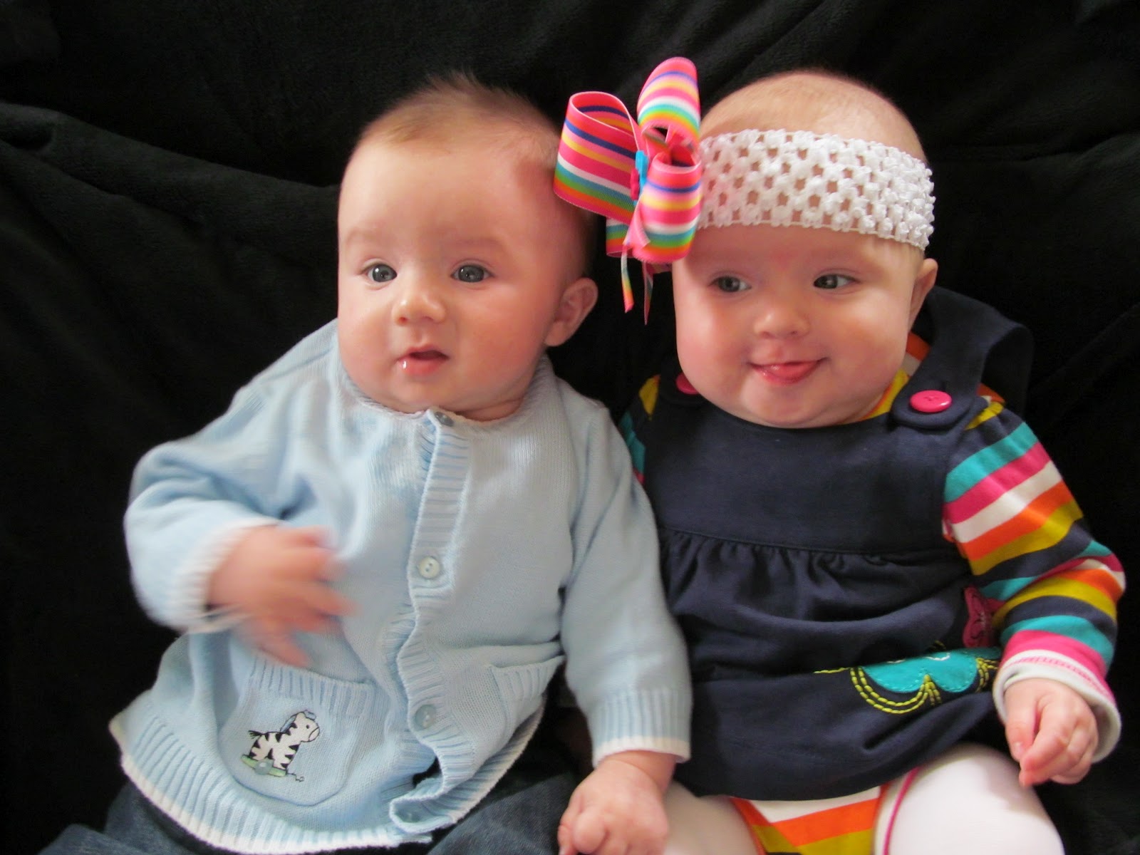 Daytime: Babes are spending even more awake time. They like to get cozy, and sit on our tummies when we’re laying flat, with their back’s on our theighs. The babies got their first puppets for Easter (a Duck and a Bunny) which they love. With the bunny we sing Little Bunny FooFoo and the one about a Rabbit in the Wood. With the Duck, we sing Five Little Ducks (the one “with a feather on his back” and the one that “went out to play over the hill and far away). Favorite toys include the mesh balls, the Blue Elephant/Yellow Giraffe sensory toys, the Play Gym (now reaching for toys and putting in mouth), and have gotten super active on the bouncy seats. Feedings are 6am (B) 9am (J and sometimes B), Noon, 3pm, 6pm, 9pm, 11pm