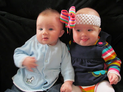 Milestones: Both babies are grabbing at things, and are doing much better at strengthening their necks with Tummy Time and sitting up in their Bumbo Seats. Brayden is wearing some 3-6 month clothes, and Julie is in all 3-6 month clothes. Brayden has begun rolling over – both from Back to Front and Front to Back. Way to go little boy!!! Brayden also likes to giggle when we blow raspberries on his tummy. Julie loves to play Patty Cake and squeals with happiness. We joke that the babies sound like “pterodactyls” because of the loud noises they tend to make from time to time. Julie is an extremely happy baby when she wakes up and very rarely cries. Their eyes are still both blue, so fingers crossed they’ll be staying that way!