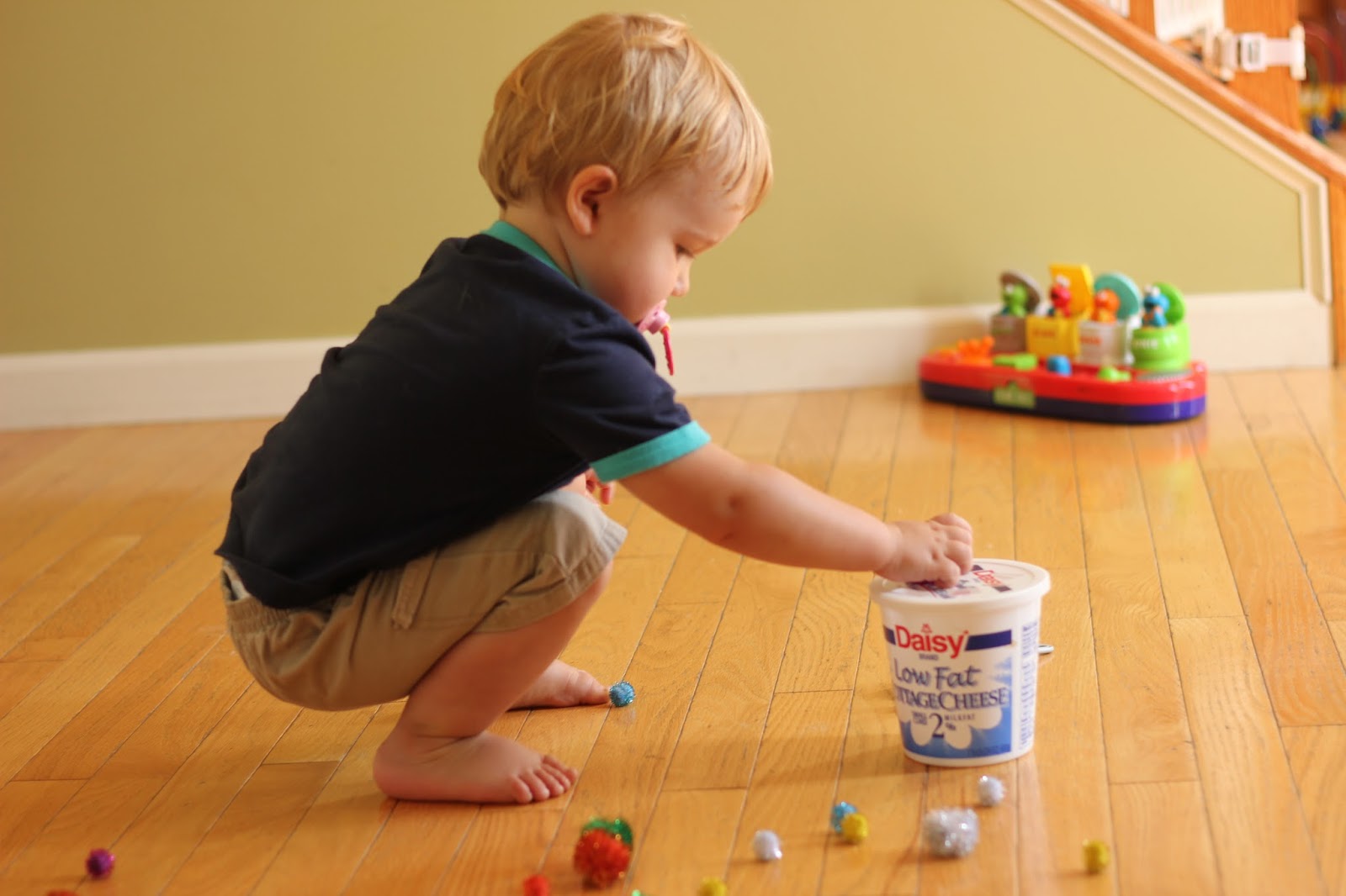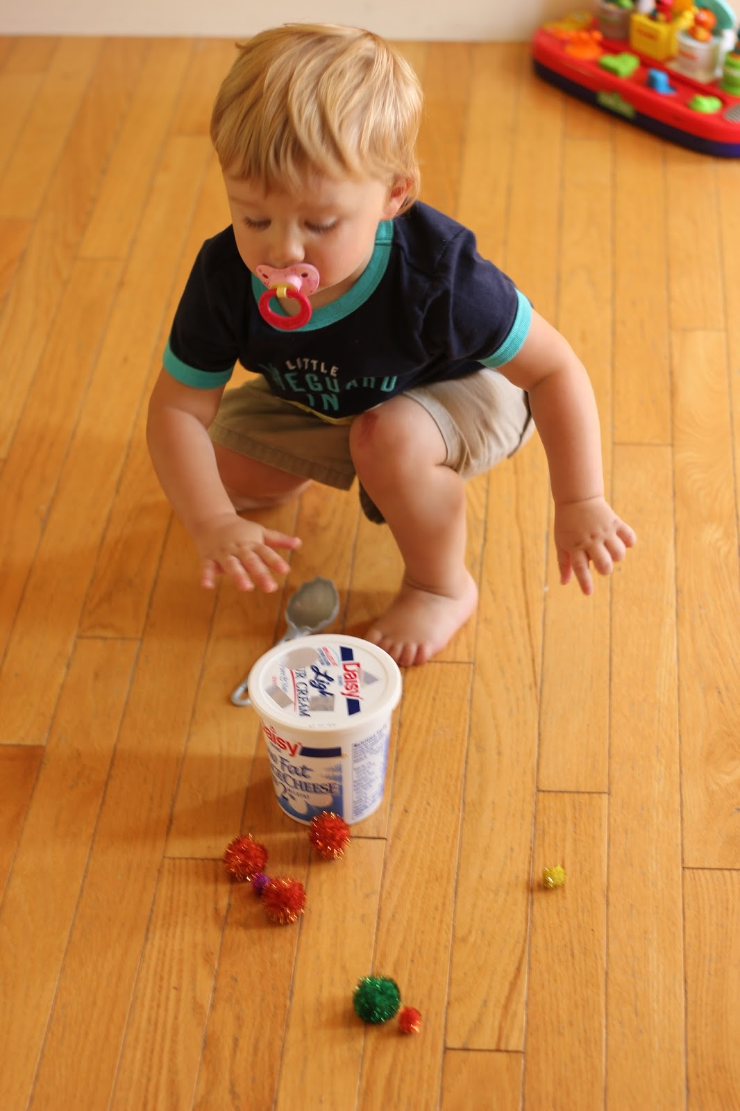 Pros: Cheap, easy, and occupied the babies for quite some time! Because of my (too) large hole, the babies enjoyed the added benefit of shaking the smaller puffs out of the tub once they were all in which worked out kinda well in the end. This one is one of Brayden’s favorite activities and especially likes the shiny pompoms for some extra interest and texture.