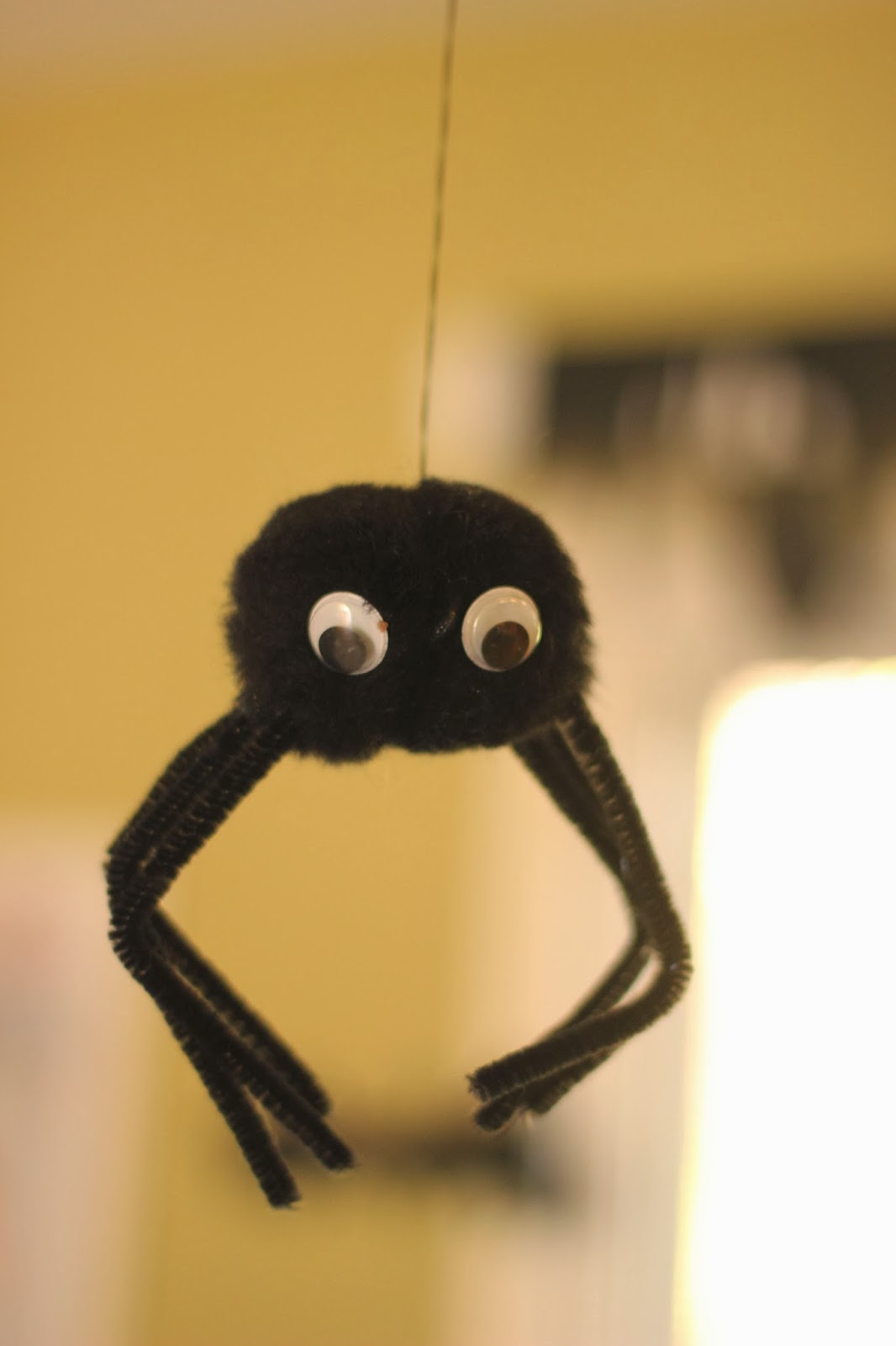 These little guys are two large pom-poms (or pom-pons depending on your dialect) glued together – pipe cleaner legs, googly eyes and upholstery thread string. We hang these from our kitchen “chandelier” above the kids’ high chairs for some spooky dining buddies!
