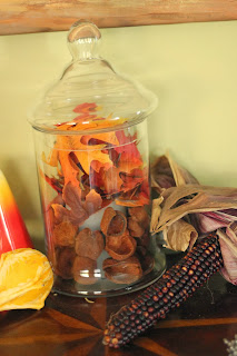 My mom gave me this lovely apothecary jar for my birthday gift. I placed a white pillar candle inside to take up some space and help better fill the space with faux leaves and seed pods.