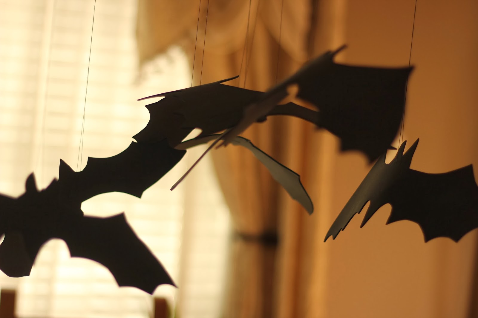 You may have seen these little guys in our recent post about our new family portrait! My awesomely creative mom traced one of the bats from the ones on our sliding door – onto some fun foam. We cut them out and threaded more upholstery thread through a little stitch on their back and hung them from the chandelier. Brayden especially loves when I lift him and run him through the “batty bats” and let them dangle on his head. These are one of my favorite things about Halloween!
