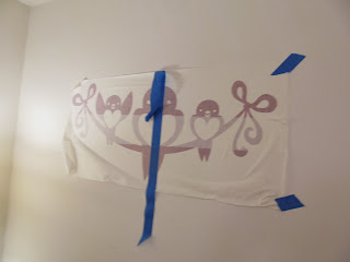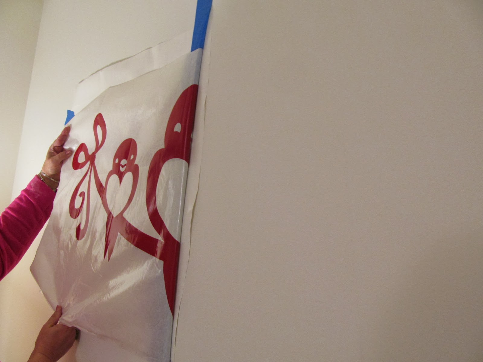 The decal is backed with two sheets of paper backing on both sides. So first, (after lightly washing the wall with a wet rag) we lined tacked the decal to the wall using painters tape. Using a level, we made sure that our image was straight and right where we wanted it to be.
