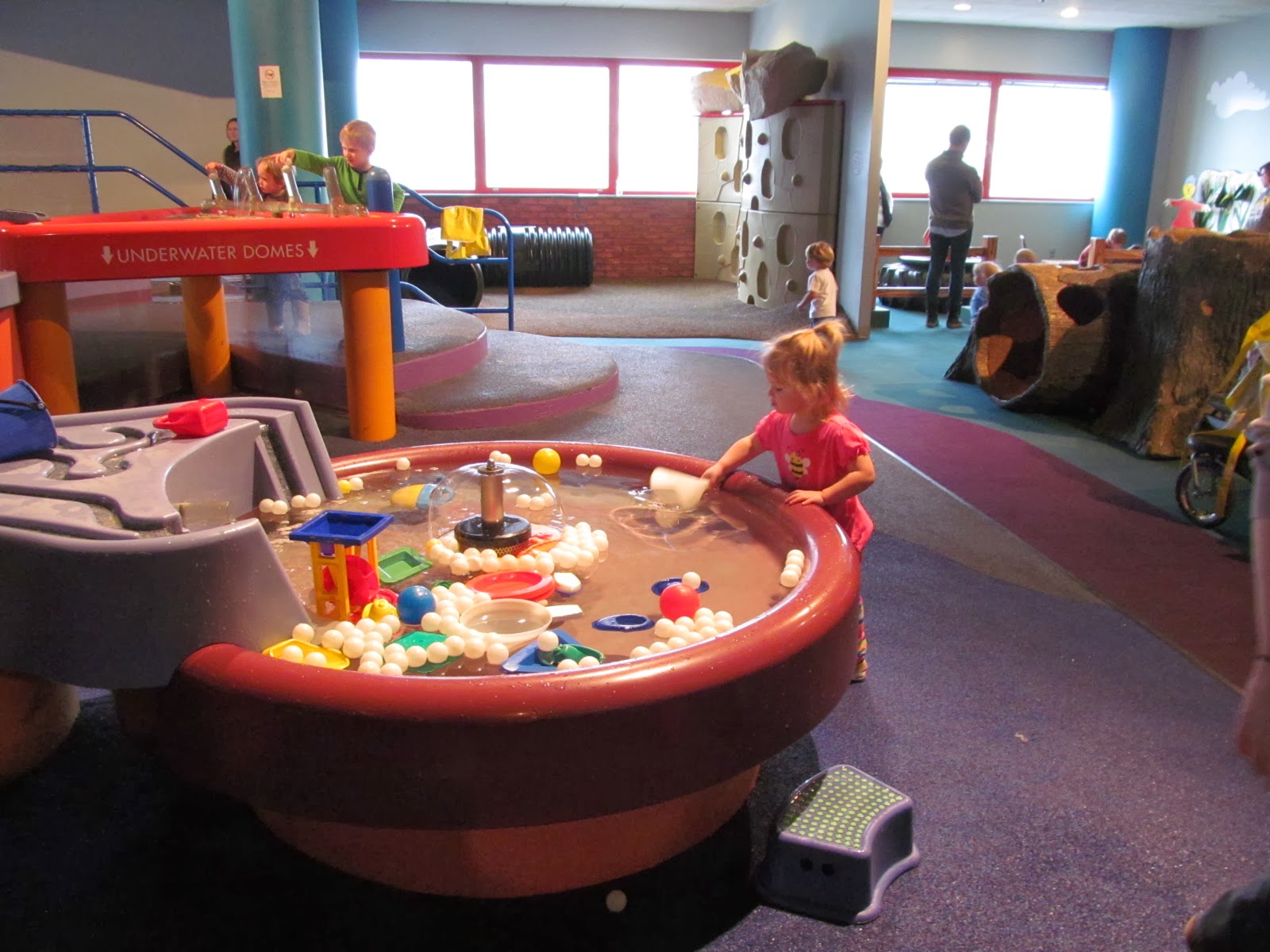 One of the main highlights of the activity area, for kids aged 3-6, is the giant water table. Complete with fountains, streams, lots of balls, funnels, scoops and more – it’s the first place my kids run when arriving. I hustle to strap them into the provided smocks before they get their clothes soaked. If your kids are like mine though, smocks don’t offer much protection. I dress them in layers to keep long sleeves from dipping into the drink, and bring extra clothes all the way down to alternate shoes. SUPER fun and worth the drive down all on it’s own!